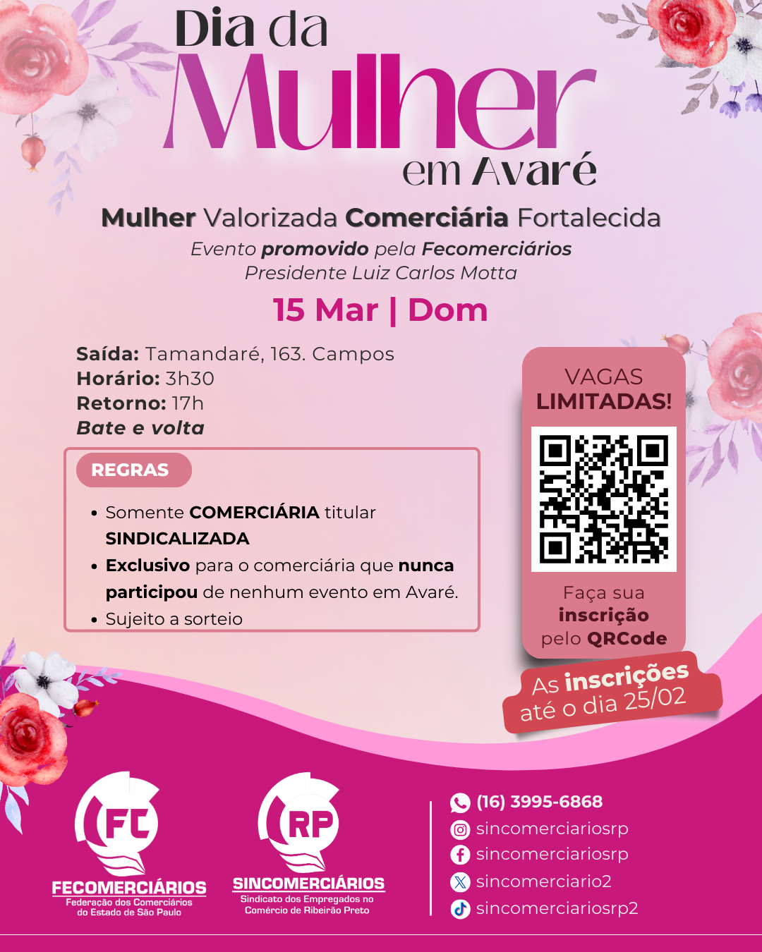 🌸 Mulher Valorizada, Comerciária Fortalecida 2026 🌸 Convite Especial Em comemoração ao Dia da Mulher, o Sincomerciários de Ribeirão Preto levará comerciárias sindicalizadas ao sindicato para um dia especial no Centro de Lazer em Avaré, no dia 15 de março para participarem, do evento “Mulher Valorizada, Comerciária Fortalecida”, promovido pela Fecomerciários. Imperdível, um dia inteiro…