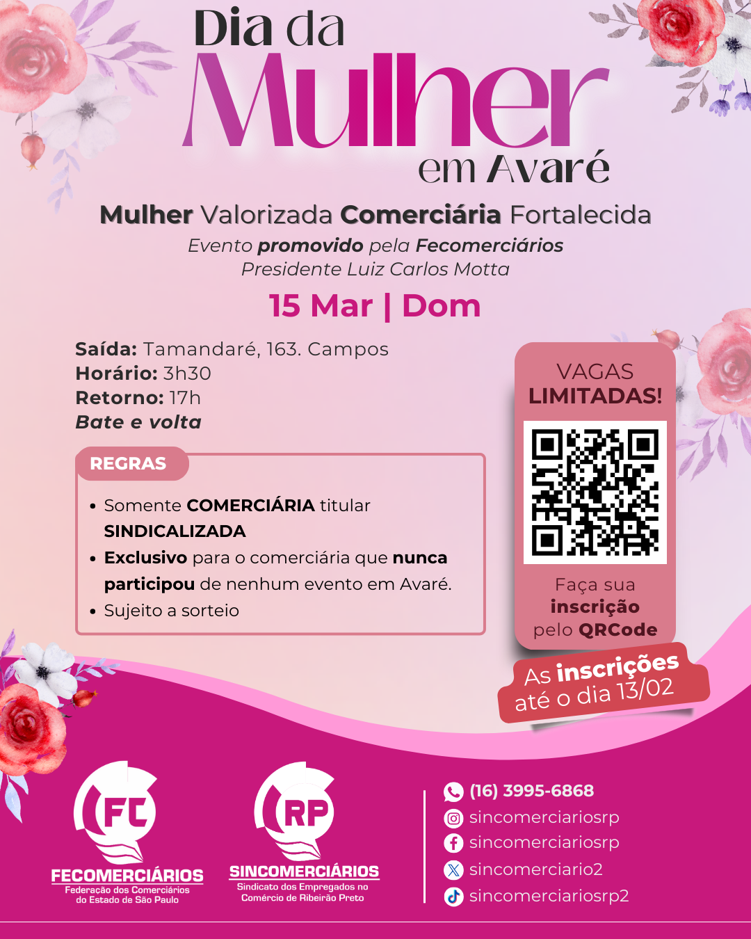 Em comemoração ao Dia da Mulher, o Sincomerciários de Ribeirão Preto levará comerciárias sindicalizadas ao sindicato para um dia especial no Centro de Lazer em Avaré, no dia 15 de março para participarem, do evento “Mulher Valorizada, Comerciária Fortalecida”, promovido pela Fecomerciários. Imperdível, um dia inteiro de lazer com todas as despesas pagas!
